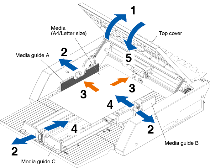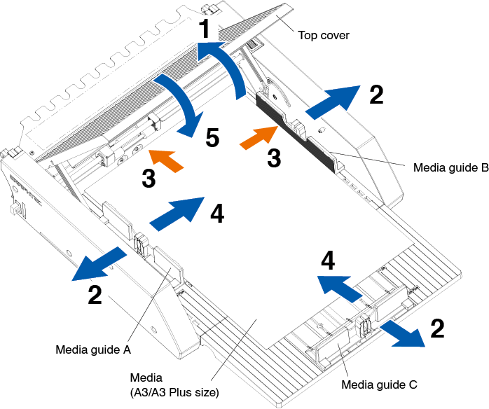 2. Move media guides A, B and C in the directions indicated by the blue arrows.