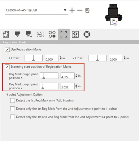 The first registration mark position in the design document is set as the default in [Reg Mark origin print position X (and Y)].