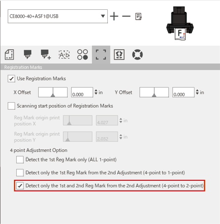 When selecting the [Detect only the 1st and 2nd Reg Mark from the 2nd Adjustment (4-point to 2-point)] on the CUTTING screen, all four registration marks are scanned on the first sheet, and only two registration marks are scanned from the second sheet onwards.