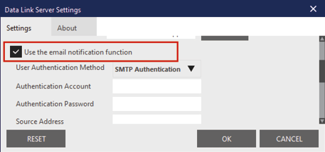 When selecting the [Use the email notification function] on the [Data Link Server Settings] screen, an email notification is sent to the specified address when continuous operation using [Data Link Server] stops.