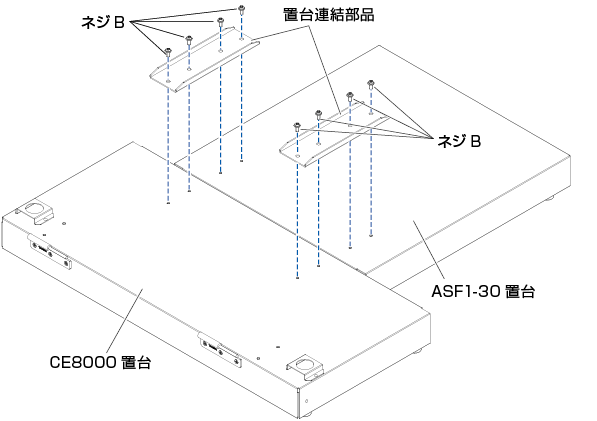 1 プラスドライバーを使用して、CE8000置台とASF1-30置台を置台連結部品2個とネジB 8本で取り付けます。