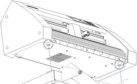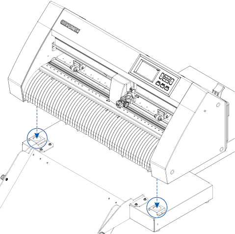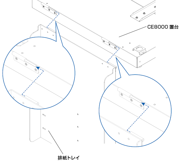 2 CE8000置台のヒンジ2箇所に排紙トレイのヒンジ2箇所を差し込みます。