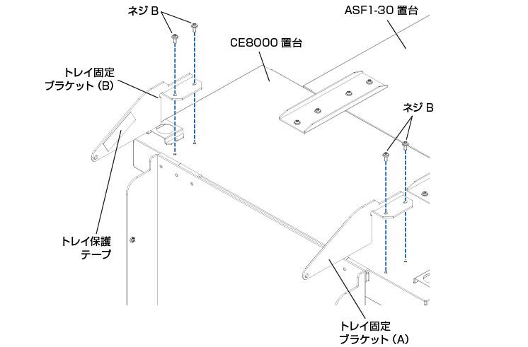 トレイ固定ブラケット(A)とトレイ固定ブラケット(B)を取り付ける際は、トレイ固定ブラケット(A)とトレイ固定ブラケット(B)に貼られているトレイ保護テープが内側になっていることを確認してください。