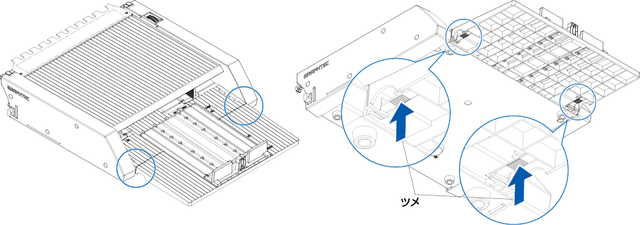 1 延長トレイのツメを押しツメのロックを解除しながら、延長トレイを引き抜きます。