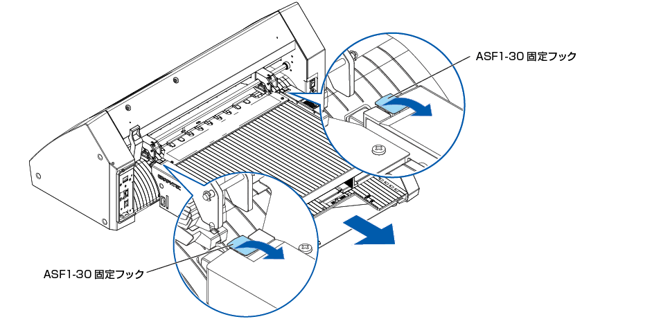 4 ASF1-30固定フックを上に上げ、ASF1-30を後方に取り外します。