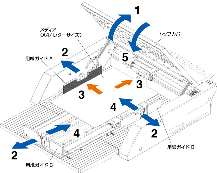 4 用紙ガイドA・Cをメディアに合わせて調整します。