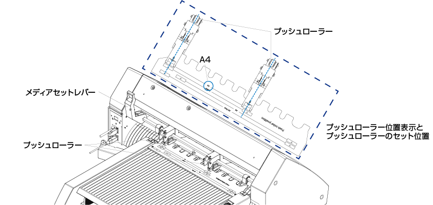 ● メディアはプッシュローラーの下まで搬送してください。搬送しすぎるとメディアが斜行し、正しくプッシュローラーの位置が調整できなくなります。