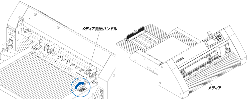 メディア搬送ハンドルを使用してメディアを搬送するほか、メディアの給紙、排出機能を使用してもメディアをセット、排出して調整ができます。